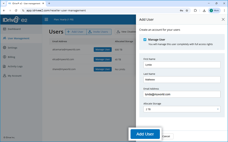 Yes. As a reseller, you can create managed customer accounts by selecting the 'Manage User' option while adding users to your IDrive® e2 reseller account. This setup lets you allocate storage, manage permissions, and retain full control over the accounts. You can also generate access keys and secret keys to provide secure customer access, ensuring complete administrative oversight and safeguarding sensitive account information.